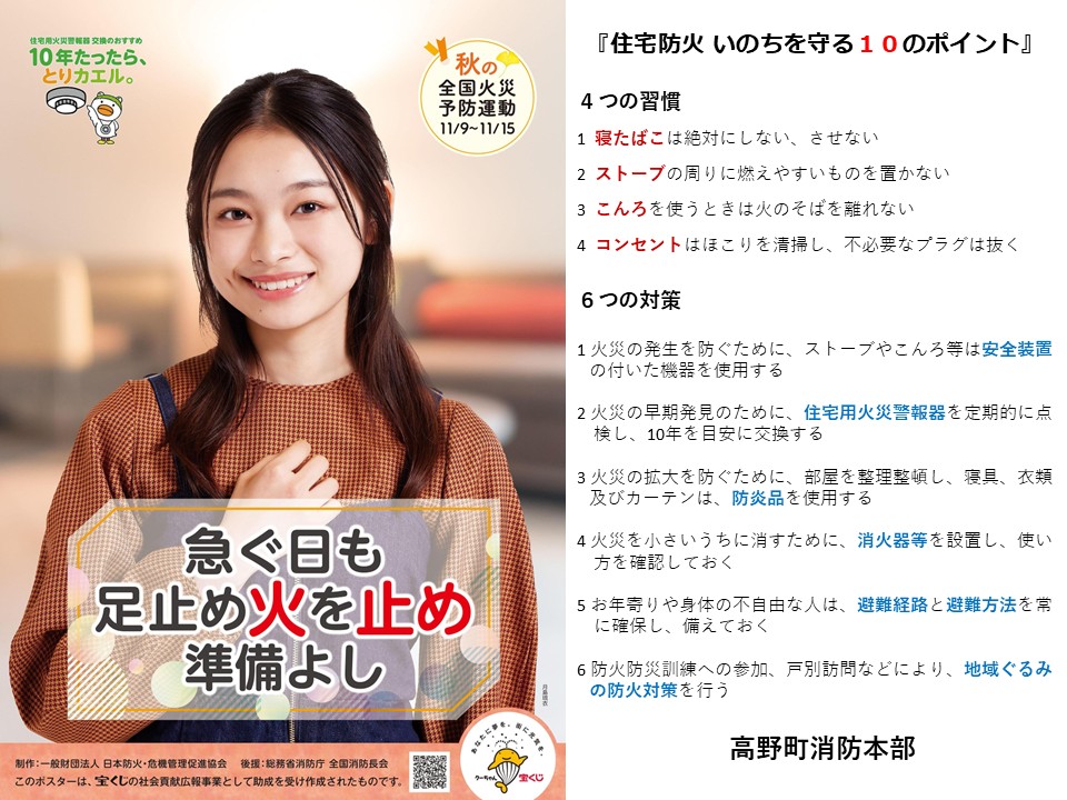 11月9日から11月15日までの一週間、全国一斉に秋の火災予防運動を実施します。この運動は、火災が発生しやすい時季を迎えるにあたって、町民の皆様に防火防災意識や防災行動力を高めていただくことにより、火災の発生を防ぎ、万が一発生した場合にも被害を最小限にとどめ、火災から尊い命と貴重な財産を守ることを目的として行います。高野町消防本部でも住民皆様の防火意識の向上を図るため、様々な取り組みを展開します。