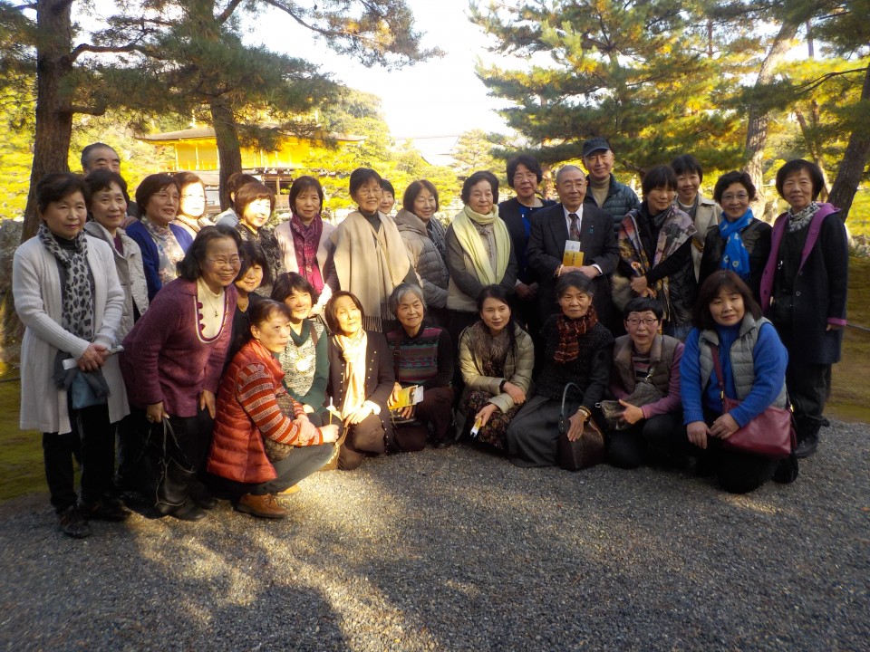 最後は、金閣寺(きんかくじ)(鹿苑寺(ろくおんじ))です。お大師様が作られたといわれる秘仏の石不動明王(いしふどうみょうおう)が不動堂に祀(まつ)られています。公民館運営審議委員会 東山会長のご配慮で特別拝観することが出来ました。漆塗りに金箔を張った豪華な造りの舎利殿(しゃりでん)、杮葺(こけらぶき)の屋根の上には鳳凰(ほうおう)が輝いていました。鏡湖池(きょうこち)に風雅な姿を映し出している「さかさ金閣」を運よく見ることが出来ました。参加者の皆さんは、金閣寺の美しさにとても感激し雅な時間を過ごしました。たくさんの国宝、文化財にふれ有意義な研修となりました。