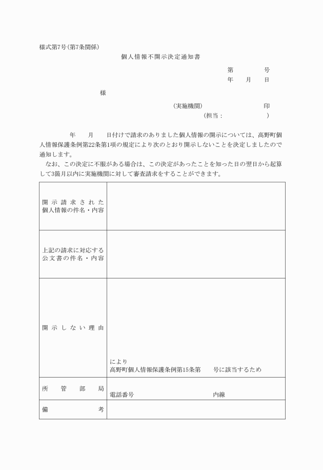 (3) 個人情報の開示をしないことの決定 個人情報不開示決定通知書(様式第7号)