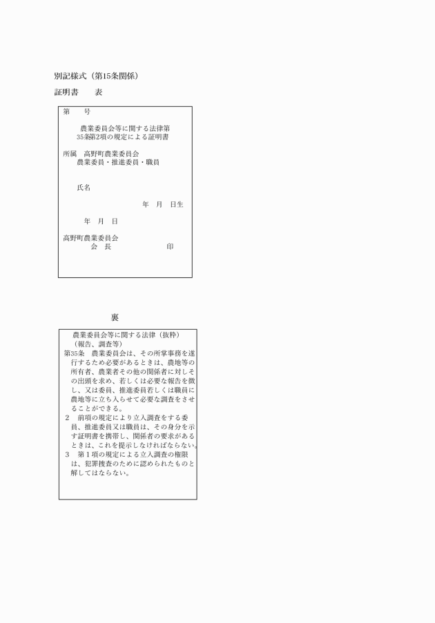 第15条 委員、農地利用最適化推進委員及び職員が、所掌事務を行うため、立入調査をするときの身分を示す証明書を別記様式のとおり定める。