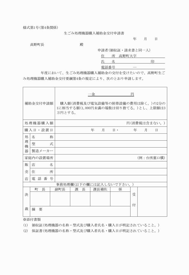 第4条 補助金の交付を受けようとする者(以下「申請者」という。)は、処理機器を購入した日の属する年度の申請期間内に次に掲げる書類を提出し、申請しなければならない。ただし、処理機器付き住宅を購入した者は、転入した年度の申請期間内に申請するものとする。