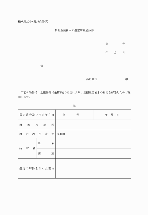 5 法第35条第3項において準用する法第30条第1項の規定による通知は、景観重要樹木の指定解除通知書(様式第20号)によるものとする。
