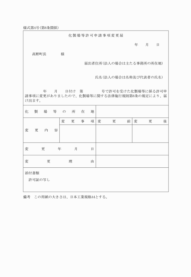 第4条 法第3条第1項の規定により化製場又は死亡獣畜取扱場の設置の許可を受けようとする者は、次に掲げる事項を記載した申請書(様式第2号)を高野町長に提出しなければならない。