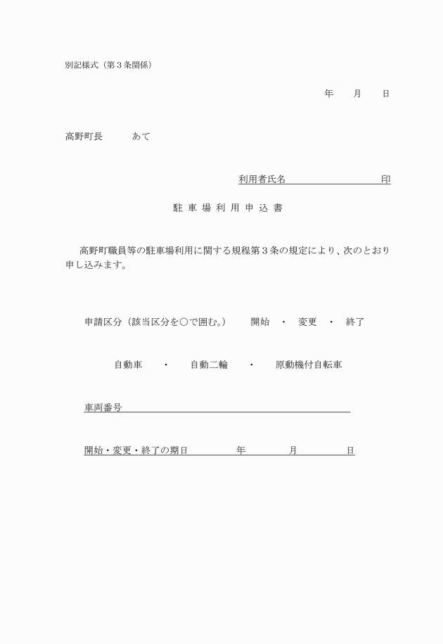 第3条 駐車場の利用を開始し、変更し、又は終了する職員等は、あらかじめ駐車場利用申込書(別記様式)を町長に提出し、承認を受けなければならない。