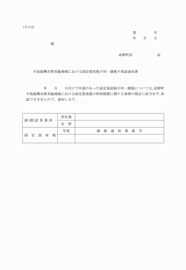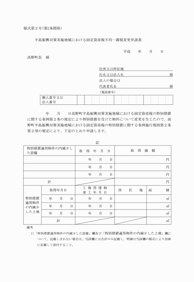 2 特別措置の通知を受けた者が、特別措置物件に変更を生じた場合は、その変更の日から30日以内に半島振興実施地域における固定資産税不均一課税変更申請書(様式第2号)を町長に提出しなければならない。