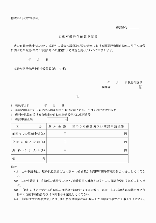 第1条 高野町の議会の議員及び長の選挙における選挙運動用自動車の使用の公営に関する条例(令和2年高野町条例第19号。以下「条例」という。)の第2条の規程の適用を受けようとする者は、条例第3条に規定する有償契約を締結した場合には、直ちに(立候補の届出前に当該契約を締結した場合には、立候補の届出後直ちに)、当該契約に関する書面の写しを添えて、同条の規程による届出をしなければならない。