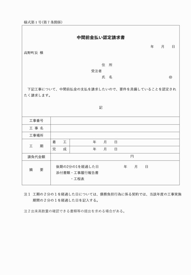 (3) 中間前金払の認定は、当該請求を受けた日からおおむね7日以内(高野町の休日を定める条例(平成2年6月30日高野町条例第8条)に規定する市の休日を含まない。)に行うものとする。ただし、請負者からの提出書類に不備等があった場合は、この限りでない。