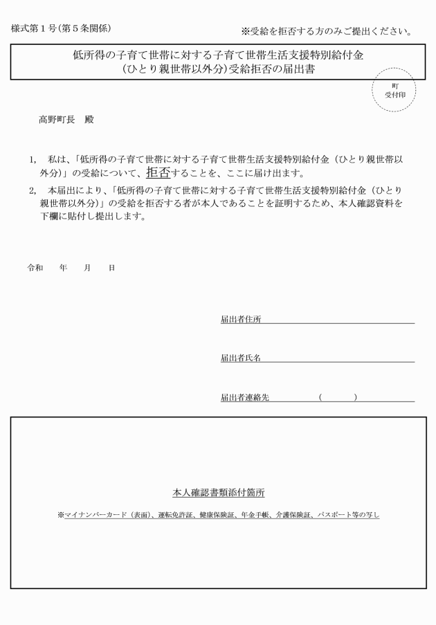 第5条 町長は、児童手当等受給・非課税者及び新規児童手当等受給者・非課税者に対し、本給付金の支給の申込みを行い、受給の意向を確認したうえで、本給付金の支給を決定する。支給対象者は、支給を希望しない場合、別紙様式第1号の給付金受給拒否の届出書により届出を行う。