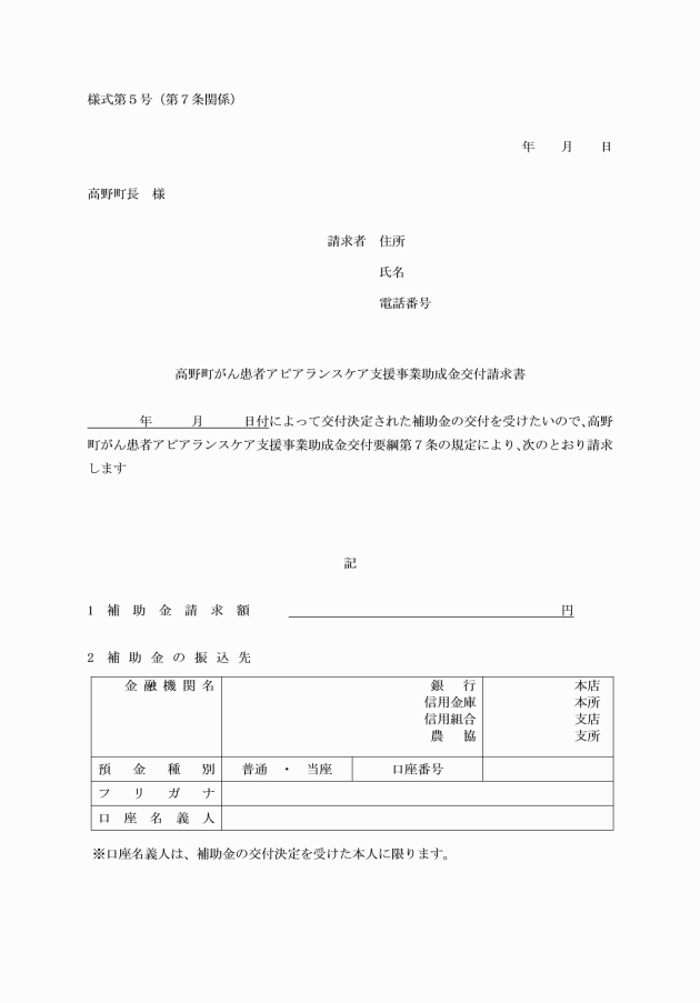 第5条 助成金の交付を受けようとする対象者又はその保護者(以下「申請者」という。)は、医療用補整具を購入した日の属する年度の翌年度末までに高野町がん患者アピアランスケア支援事業助成金交付申請書(様式第1号)に、次に掲げる書類を添えて、町長に提出しなければならない。