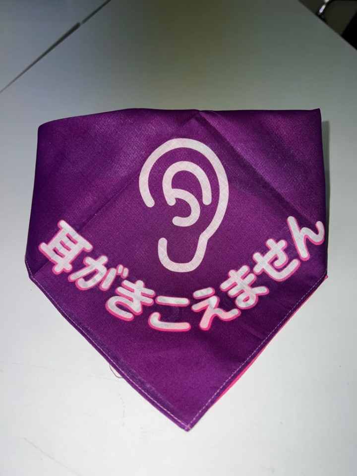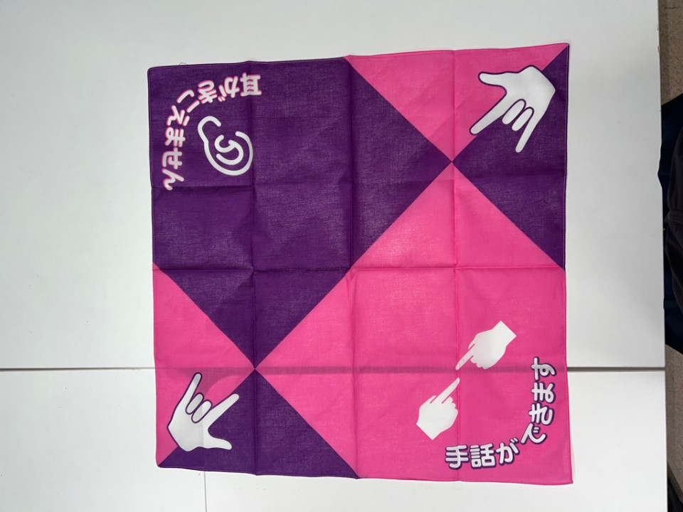 このバンダナは、サイズが縦・横54センチで、紫色と桃色の2色で四隅に「耳がきこえません」「手話ができます」というメッセージが入っています。