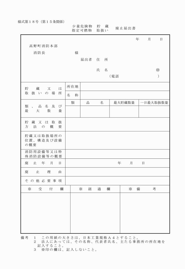 2 消防長は、第1項の届出書を受理したときは、内容を審査し、政令第2章第3節、省令第2章第2節並びに危険物の規制に関する政令(昭和34年政令第306号。以下「危険物規制政令」という。)第3章第4節及び危険物の規制に関する規則(昭和34年総理府令第55号。以下「危険物規制省令」という。)第4章に規定する基準に適合していると認めるときは、その1通に届出済印を押して返付する。
